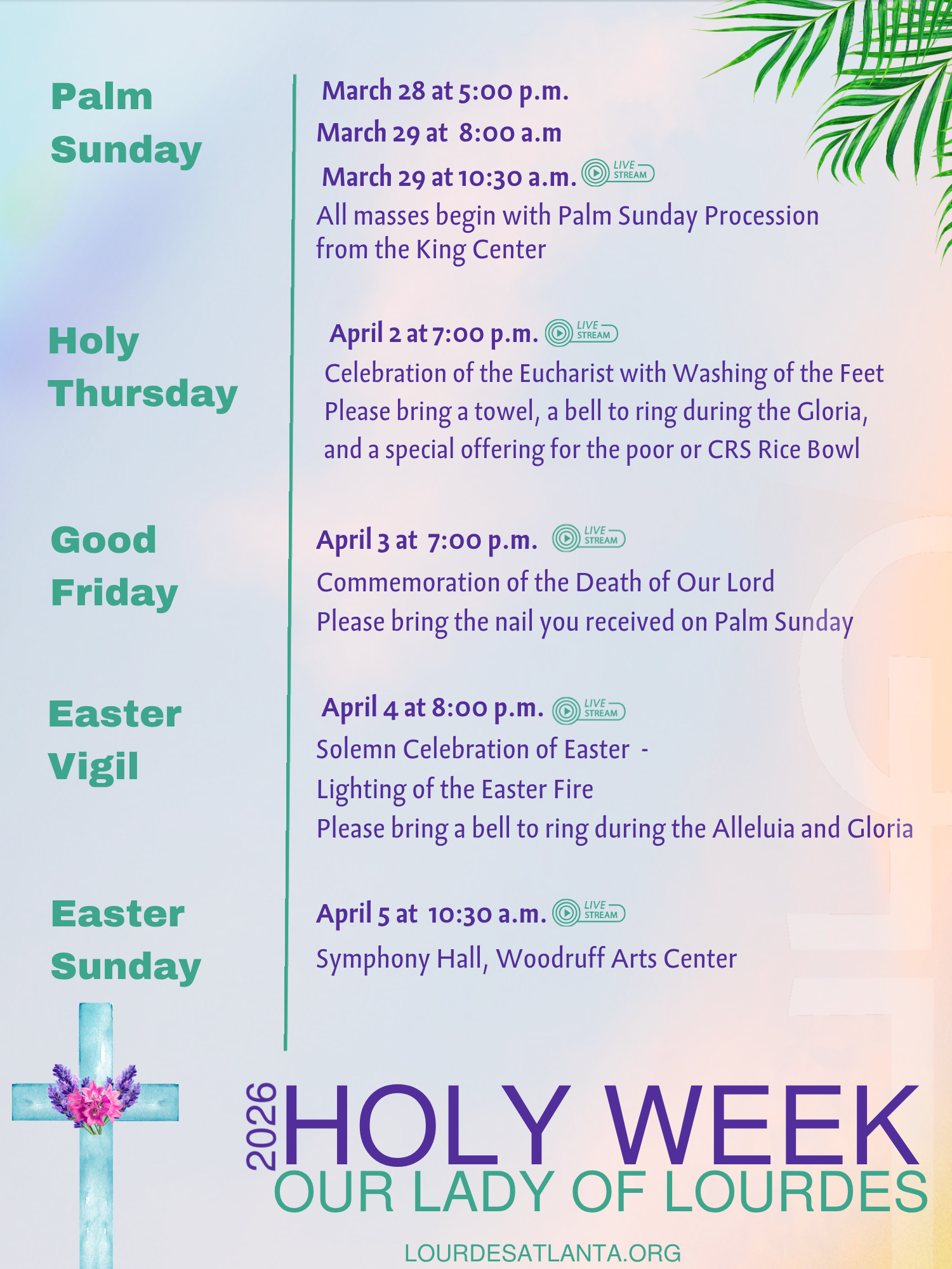We welcome all races, cultures and faiths to our dynamic Mass. We affectionately call our worship style the “Lourdes Experience” because at all of our Masses – even the Saturday vigil – you’ll find an upbeat service featuring a variety of music (gospel, spirituals, contemporary Christian and classics) accompanied by our choir and Director of Music.